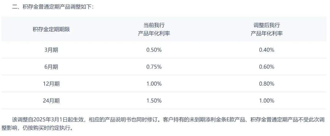中信银行公告指出,将于2月15日对个人积存金定/活期利率进行更新。活期、一个月期、三个月期、六个月期、一年期的年化利率分别由0.35%、0.48%、0.87%、1.18%和1.38%下调至0.15%、0.25%、0.40%、0.60%和1.00%。对于2025年2月14日(含)前已生效在途的一个月、三个月、六个月、一年期积存金定存业务利率到期前无影响,到期后如续存参照调整后利率执行。活期利率自2月15日起生效。