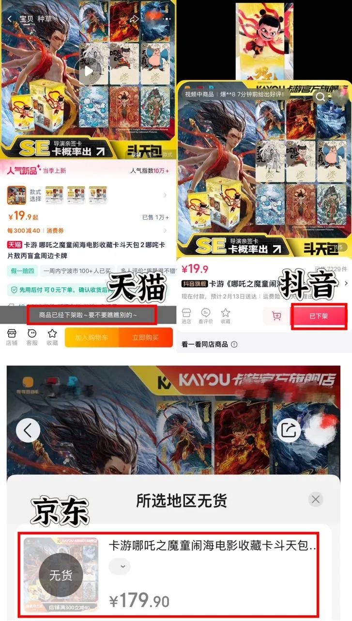 卡游哪吒“斗天包”显示天猫、抖音、JD.COM官旗缺货。