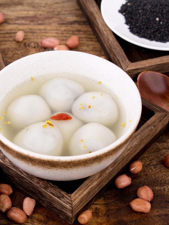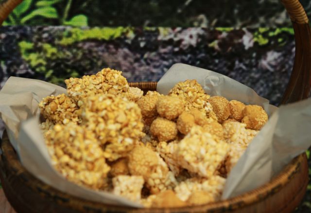 爆米花球由黄糖桨、香脆花生仁粘合而成。