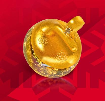整体形状为小冰壶,壶身上覆盖着金箔,整体采用镀金制成。