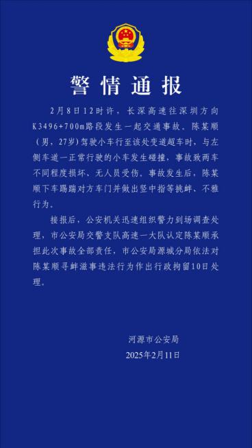 广东河源警方通报“男子开车变道碰车后挑衅对方”:行政拘留 10 日。