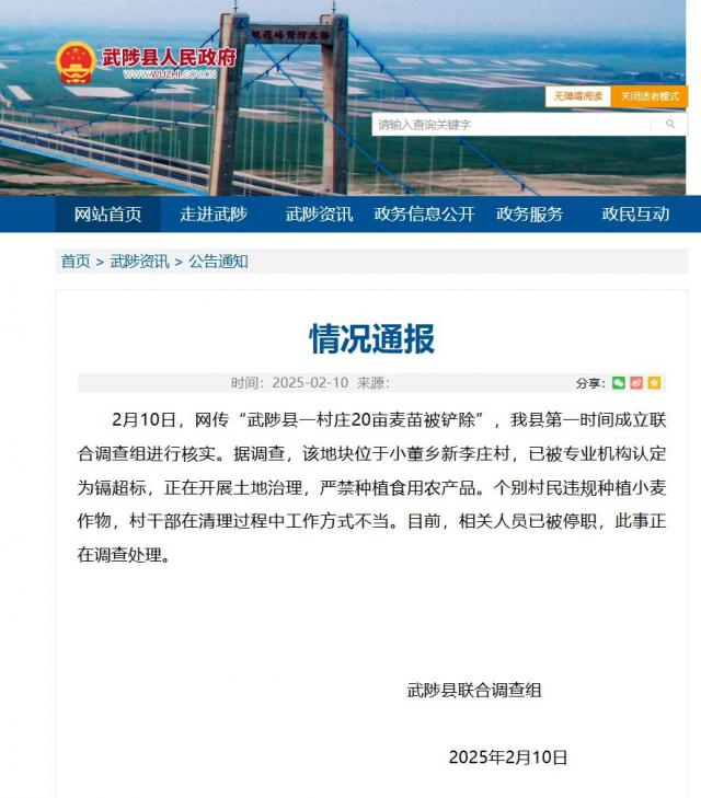 “河南一村”网爆 20 “亩麦苗被清除”,当地回应:土地治理正在进行中,有关人员已被停职。