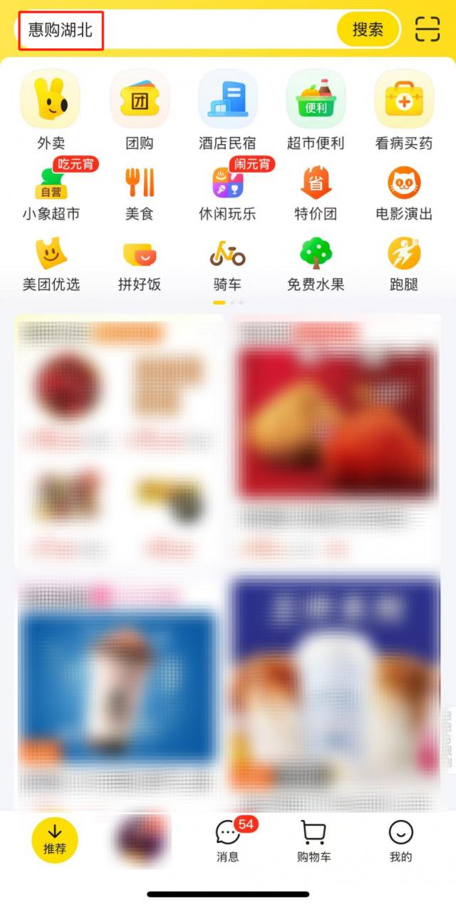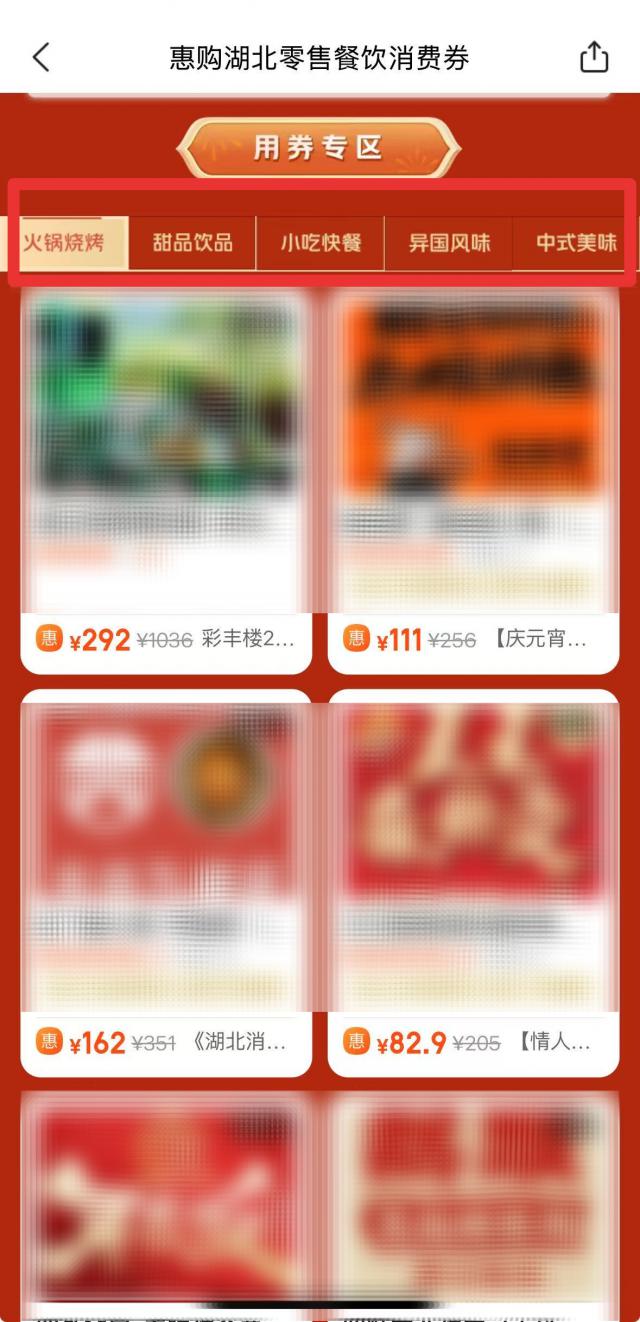 1、进入优惠券平台,在顶部搜索框中输入【惠购湖北】;或者直接点击首页中上位置的照片,即可进入领券页面,抢取当地州消费券。