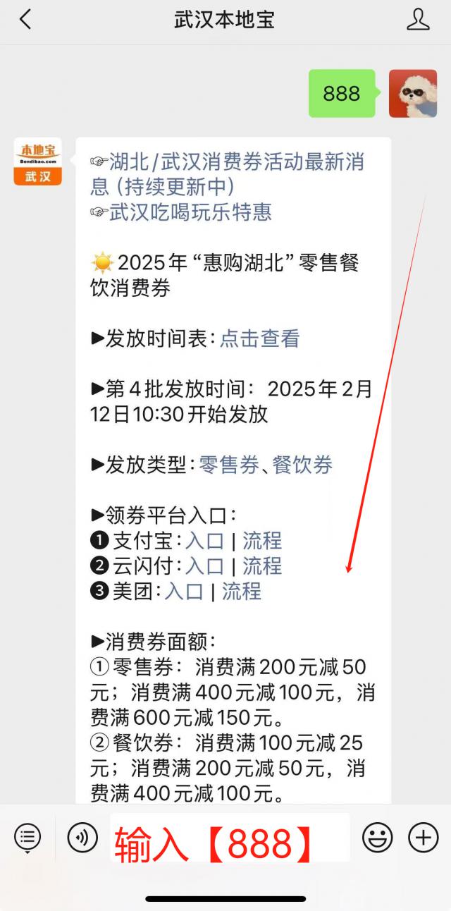 推荐服务:可以去支付宝、中国银联快通、美团平台领取,也可以扫描下面的二维码,关注一下。【武汉本地宝】微信公众号,回复聊天页面【888】可以获得收券入口,最新动态等。