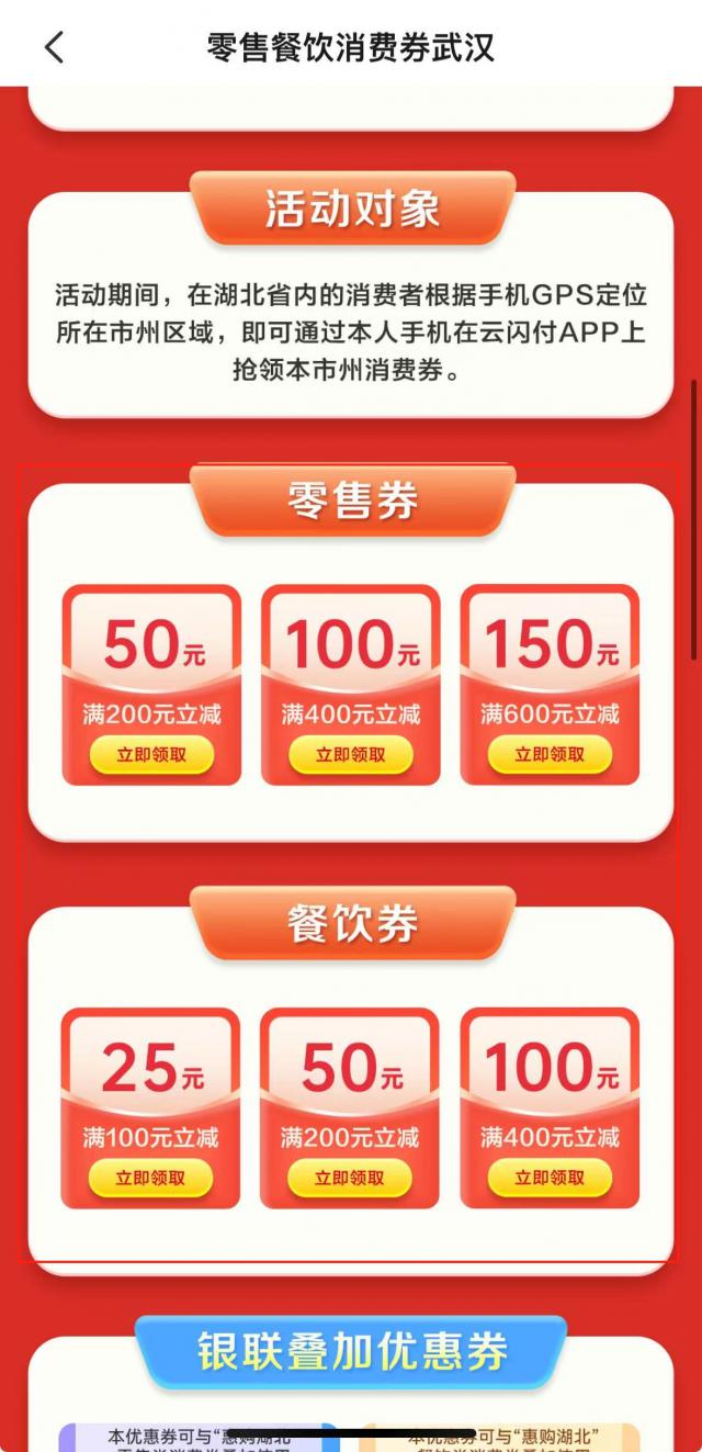 发放平台:支付宝,中国银联快通,美团;发放两种类型的线下零售和餐饮券。