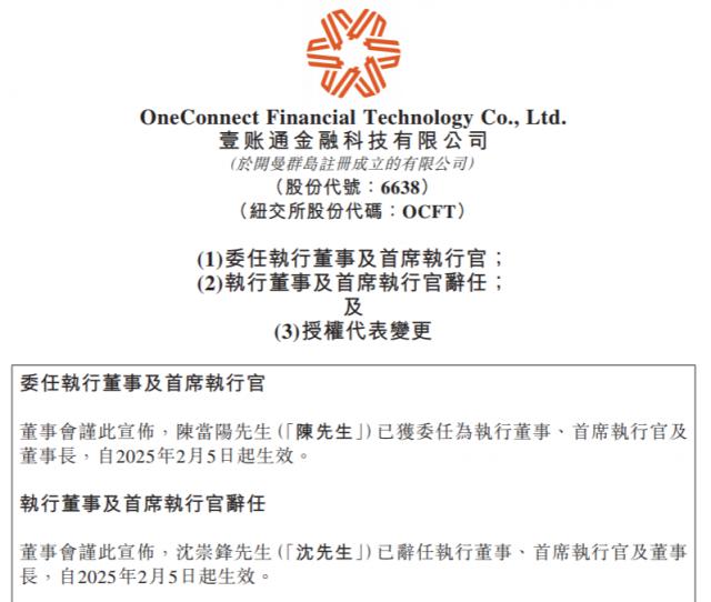 瑞财经 王敏 2 月 5 日本,金融壹账通 ( 06638 ) 经董事会决定,陈当阳已被任命为公司执行董事、CEO和董事长。