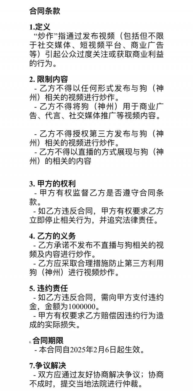 “一开始对方答应把狗还给我,但他希望我签合同。合同内容要求我不要通过视频上传、直播、第三方发布、商业广告推广等方式炒作与神舟相关的信息。,这不能引起公众的过度关注或利益。如违反合同条款,应予赔偿。 100 万元。"鲍女士说,她从来没有想过用“神舟”来蹭掉流量,但对方却如此限制她发布宠物的视频,让她难以接受。