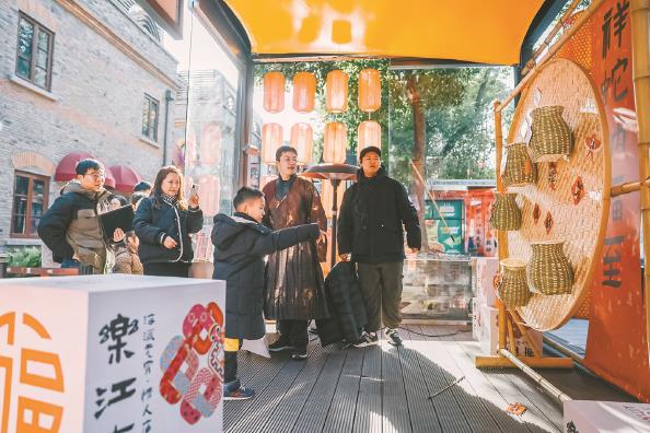 节日气氛中,“乐江南”海派元宵庙会的古风游艺互动让人停留。在广场上,不同主题的“古风”摊主装扮成古人,给游客带来不同的感受——灯谜趣事阁,大大小小的孩子们在琳琅满目的灯谜下开始思考,试图解开谜团;圆糯的福泽店,大家排队品尝热气腾腾的饺子;矢壶雅乐场,源于古代射礼的投壶游戏,吸引了很多游客拿起箭矢,玩得很开心...环顾四周,彩灯、古方香囊、马面裙、手工饰品等佳节好货目不暇接,游客络绎不绝,其中不少身着汉服。