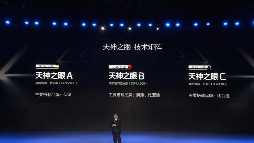 天神之眼 B(双激光雷达 DiPilot 300),或者使用英伟达单Orin-X和和赛的激光雷达,主要配备腾势品牌和王朝海洋时期的车型,以及红色天神的眼尾标志。