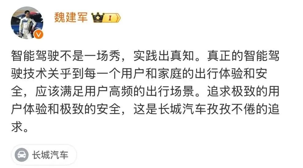 此后,长城汽车董事长魏建军也发了一条微博:智能化驾驶并非一场秀。