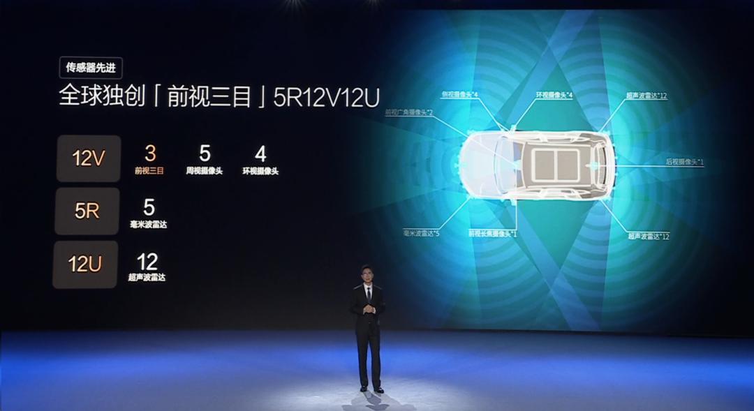 在12个摄像头中,原来的前视三目包括2个120度广角和30度长焦镜头,最远探测距离为350米;前雷达最远探测距离为300米,角雷达为120米,提高垂直探测能力;12个超声雷达,感知精度可达1厘米。