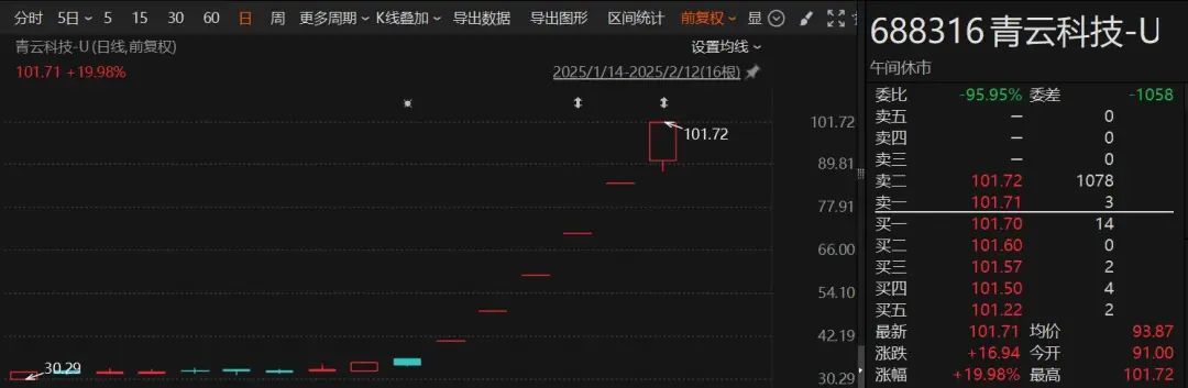 DeepSeek的收益继续扩散。今天上午,数据中心掀起了涨停潮,板块指数开盘走高,涨幅超过2%,创下历史新高。雅达股权开盘价30%一字涨停,而青云科技连续第5天涨停20%后,今天再次触及涨停,股价突破100元;浙江数字文化、浙江大学网新、杭钢等20多只股票也强势涨停或涨幅超过10%。