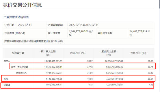根据深交所2月11日发布的竞价交易公开信息,在2025年2月5日至2025年2月11日股价严重异常波动期间,光媒中小投资者累计买入占47.18%,累计卖出占38.71%。;在上述时间范围内,机构累计购买比例为16.98%,累计售出比例为28.84%。