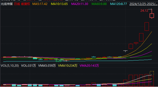 光媒成为上涨的领导者,盘中再次触及“20厘米”涨停,随后涨幅收窄。截至中午,市场收于13.33%。连续上涨后,光媒股价翻了一番,2月至今累计最高涨幅已超过150%。