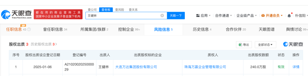 根据天眼查,王健林增加了一条股权质量信息。质量标的为大连万达集团有限公司,质量主为珠海万赢企业管理有限公司。质量股份数量为240万股,包括万达集团的全部股份。