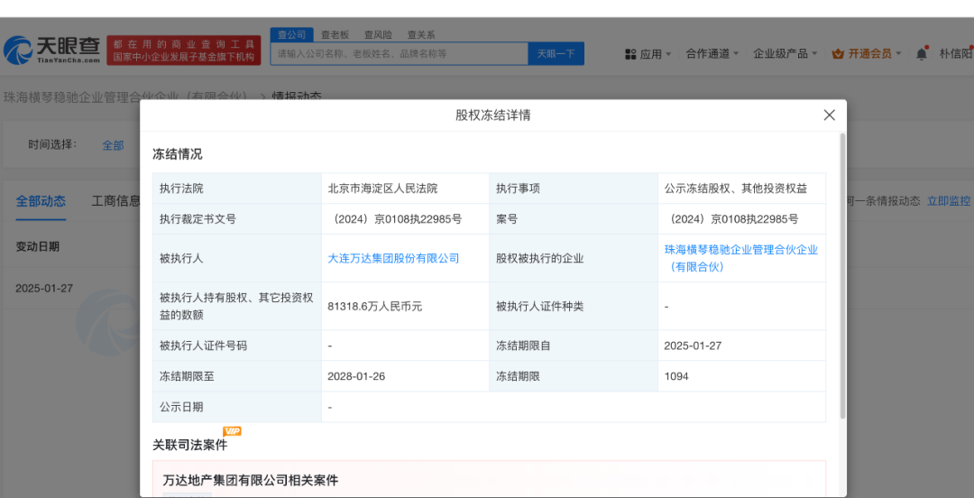近日,万达集团增加了一条股权冻结信息,冻结股权金额超过8.1亿元,冻结期为北京市海淀区人民法院,自2025年1月27日至2028年1月26日。