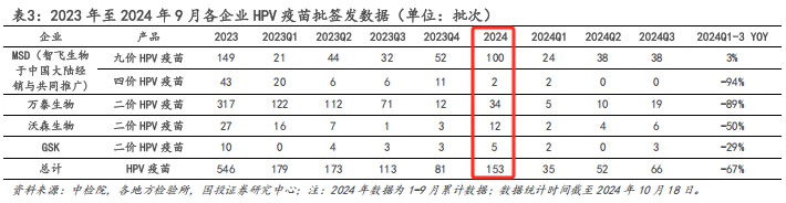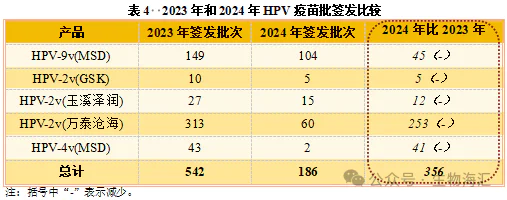 根据国投证券研究报告,2024年前三季度,万泰生物、沃森生物、GSK二价HPV疫苗、默沙东四价HPV疫苗批发均开始下降;更糟糕的是,2024年第四季度,智飞生物代理的默沙东九价HPV疫苗也未能明哲保身,再结合生物海汇公众号数据,2024年国内九价HPV疫苗批发104批,可以看出,2024Q4单季度仅获得4个批号,销售也受到阻碍。