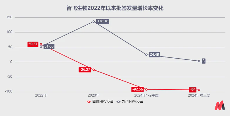 然而,智飞生物代理的四价人乳头瘤病毒疫苗确实受到了价格战的影响。由于四价人乳头瘤病毒疫苗只覆盖两种亚型,比国产二价疫苗多,但价格在800元/针左右,远高于目前几十元的二价人乳头瘤病毒疫苗价格。在此前提下,智飞生物四价疫苗销量低迷。2023年和2024年前三季度,智飞四价批发下跌。