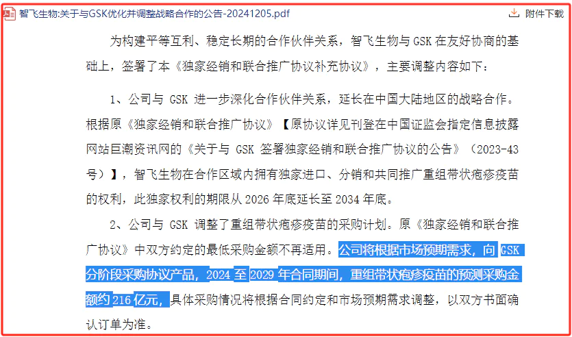 公告显示,2024年12月:在2024-2029年期间,智飞只需根据市场预测,购买Shingrix带状疱疹疫苗的金额为216亿元,这意味着平均每年购买量不低于43.2亿元。(按5年计算),仅在2025年,人乳头瘤病毒疫苗应按协议向默沙东购买260.33亿元的1/6。