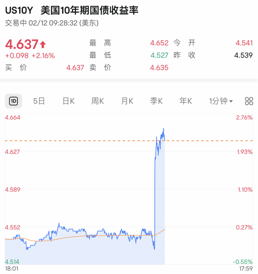 同时,美国国债市场也遭受了大幅销售,与利率预期密切相关的美国2年期国债收益率一度跃升至4.37%,美国10年期国债收益率也直线上升,目前报告为4.637%。