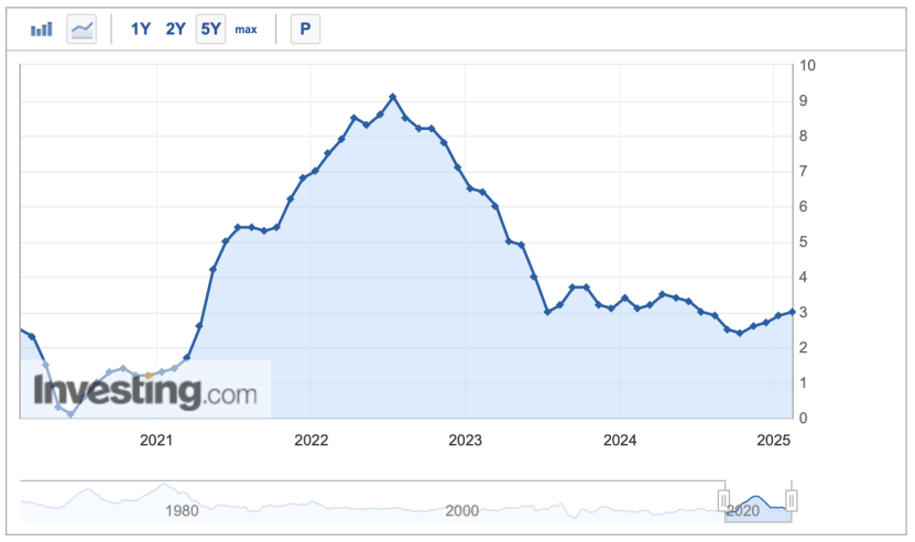 美国劳工统计局于北京时间2月12日晚发布了2025年1月的CPI报告,显示,美国1月份CPI同比增长3%,为2024年6月至今的最大增长率,高于市场预期的2.9%,之前的增长率为2.9%。;一月份CPI环比增长0.5%,也高于市场预期的0.3%,之前的数值增长0.4%。