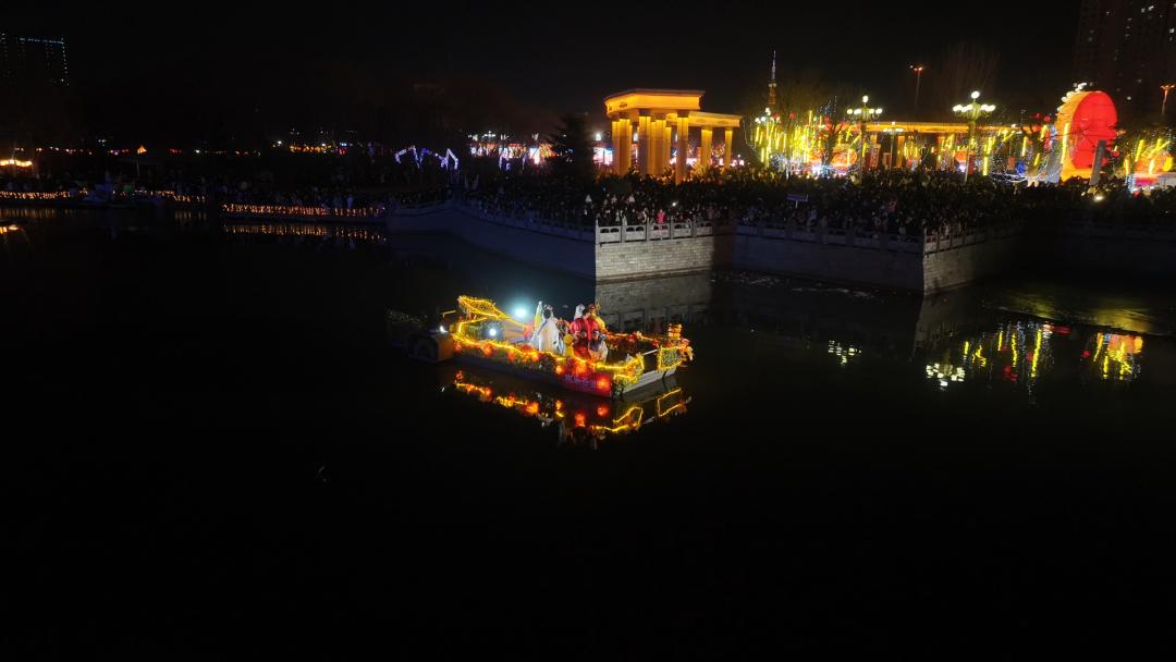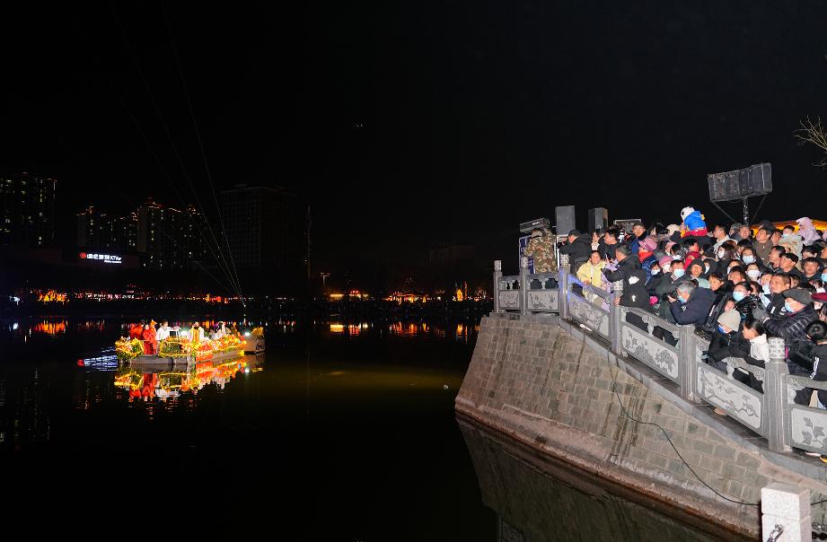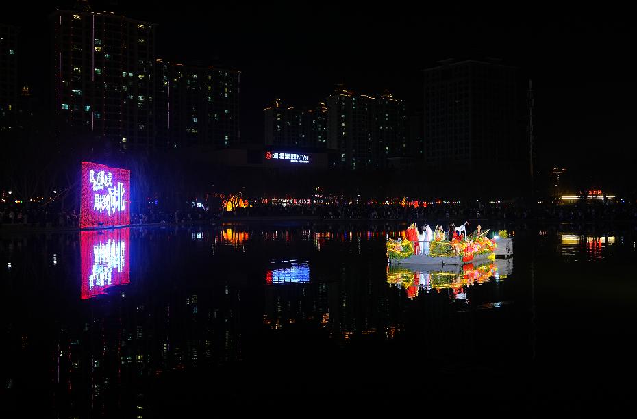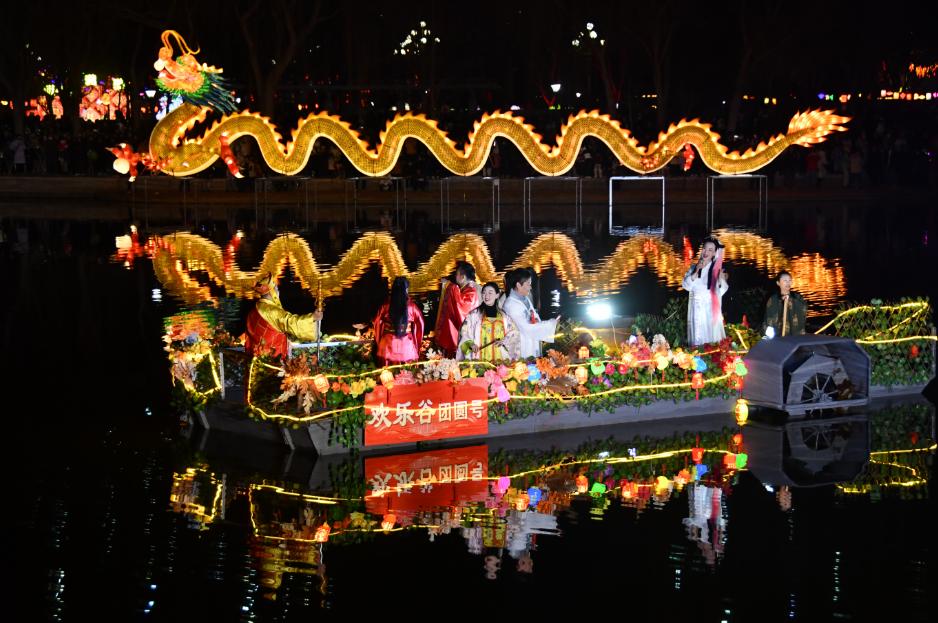 月亮上,柳梢春意近,灯火通明。伴随着悠扬的音乐,一艘新的欢乐谷团圆号游船在润泽湖公园的水面上慢慢驶来。演员们穿着盛开的衣服,唱歌跳舞,热情地与岸上的观众互动,为节日增添了不一样的浪漫和温暖。