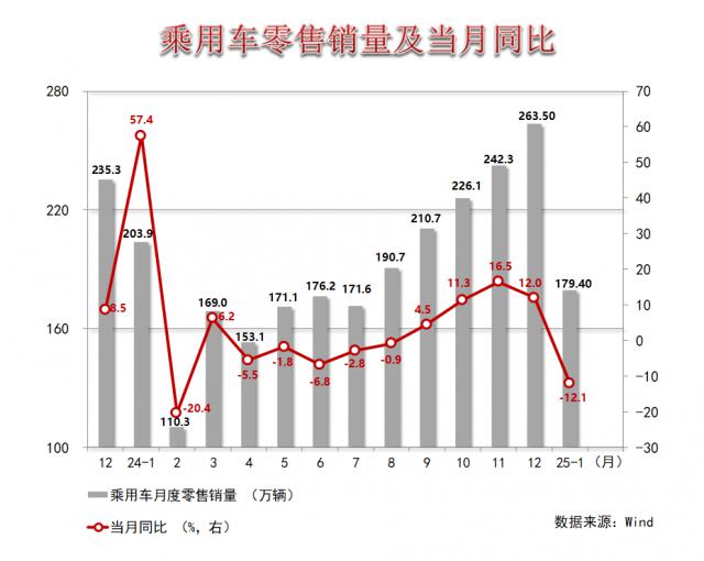 根据乘联会的数据,2025 年 1 全国乘用车市场每月零售 179.4 万台,同比下降 环比下降12.1% 31.9%。1 月度零售业处于历史低位,环比增速下降 仅次于31.9% 2023 年 1 月的 41% 减幅。