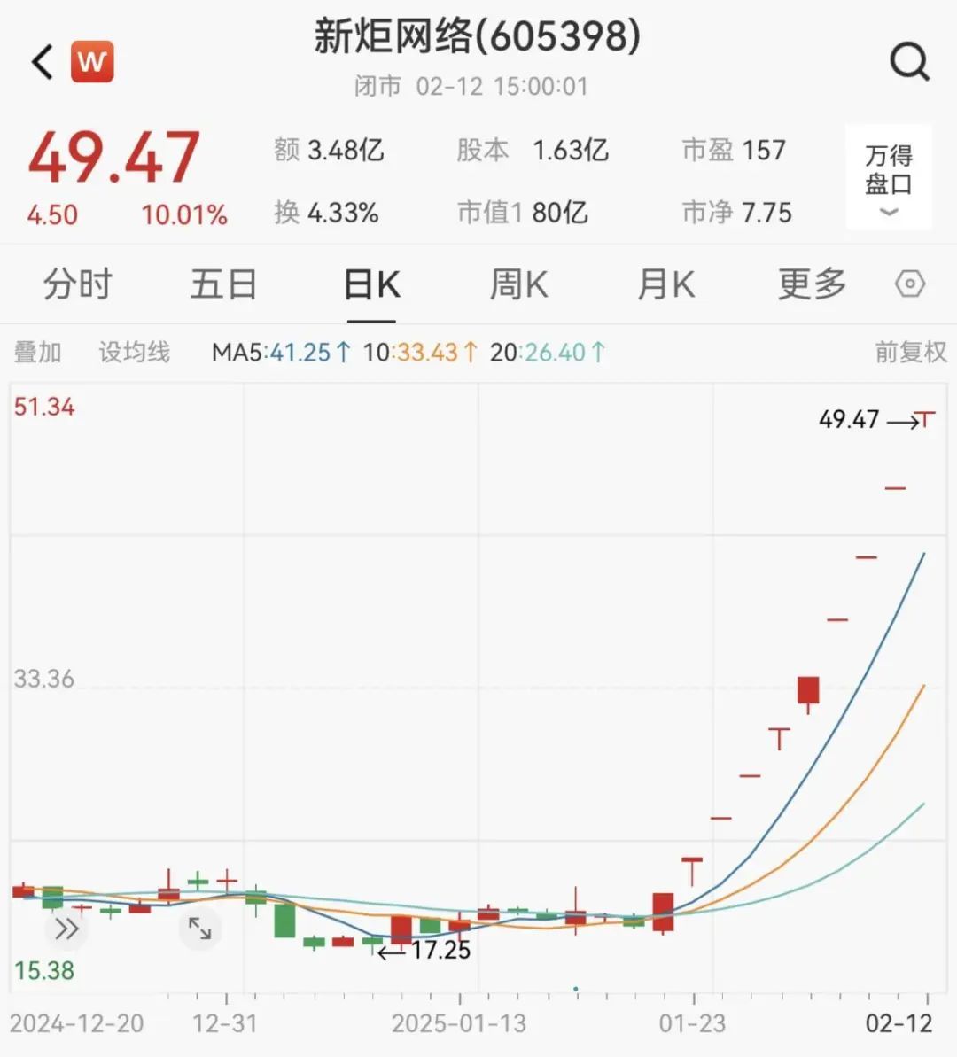 截至2月12日收盘,新炬网报49.47元/股,总市值80亿元。