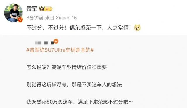接着,雷军又一次分享了一位网友的博文回应。 SU7 Ultra 金车标志”。这位网友说:“高端车型的情感价值非常重要。既然我花了钱, 80 万买这辆车,满足虚荣心并不过分。”