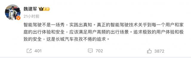 魏建军也是长城汽车董事长 2 月 11 日本发布微博称,智能驾驶不是一场秀,实践带来真知识。真正的智能驾驶技术关系到每个用户和家庭的出行体验和安全,应该满足用户的高频出行场景。追求终极用户体验和终极安全,是长城汽车孜孜不倦的追求。
