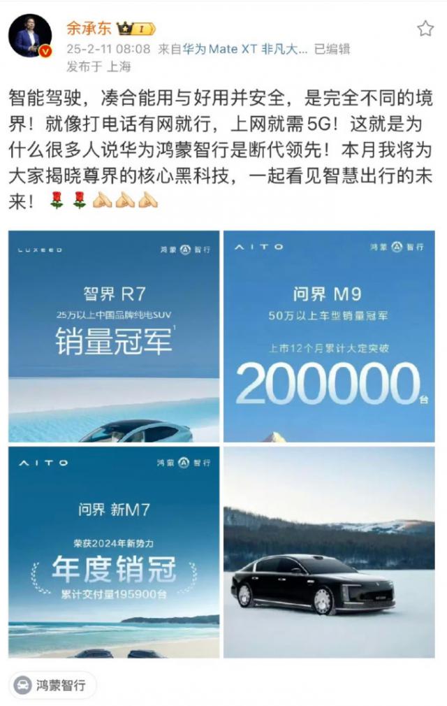 根据余承东的观点,30 一万多元才是严肃的高阶智驾,好东西就是要贵,这和比亚迪不管优劣一定要便宜是两种画风。