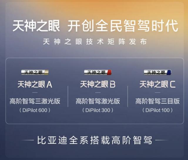 比亚迪的“神眼”框架包括三套技术规范:神眼。 A - 高级智驾三激光版(DiPilot 600);天神之眼 B - 高级智驾激光版(DiPilot 300);天神之眼 C - 高级智驾三目版(DiPilot 100)。