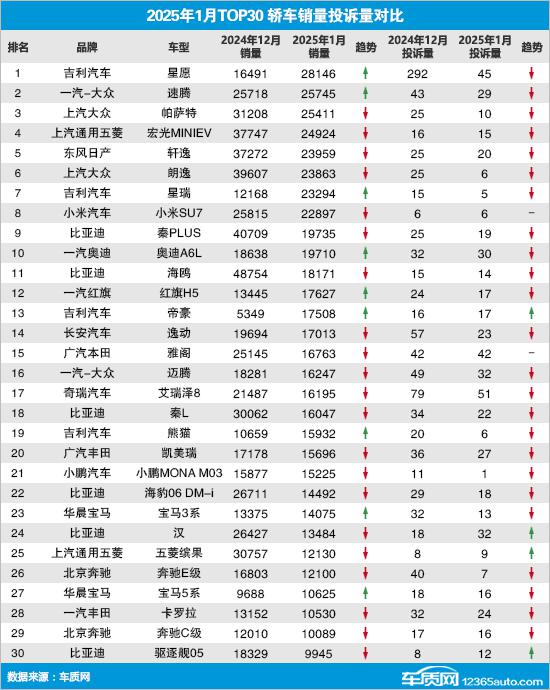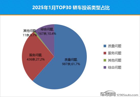 根据乘联会提供的全国汽车产销数据,2025年 年 1 当月,国内汽车市场累计零售销售。 82.6 万台,环比下降 同比下降28.4% 8.7%。与此同时,车质网受理车主对汽车的有效投诉 6,166 受春节假期影响,宗,环比下降。 同比下降28.3% 17.1%。2025年,在清除投诉人自愿申请撤诉的信息后, 年 1 月 TOP30 汽车销售投诉数量排名如下: