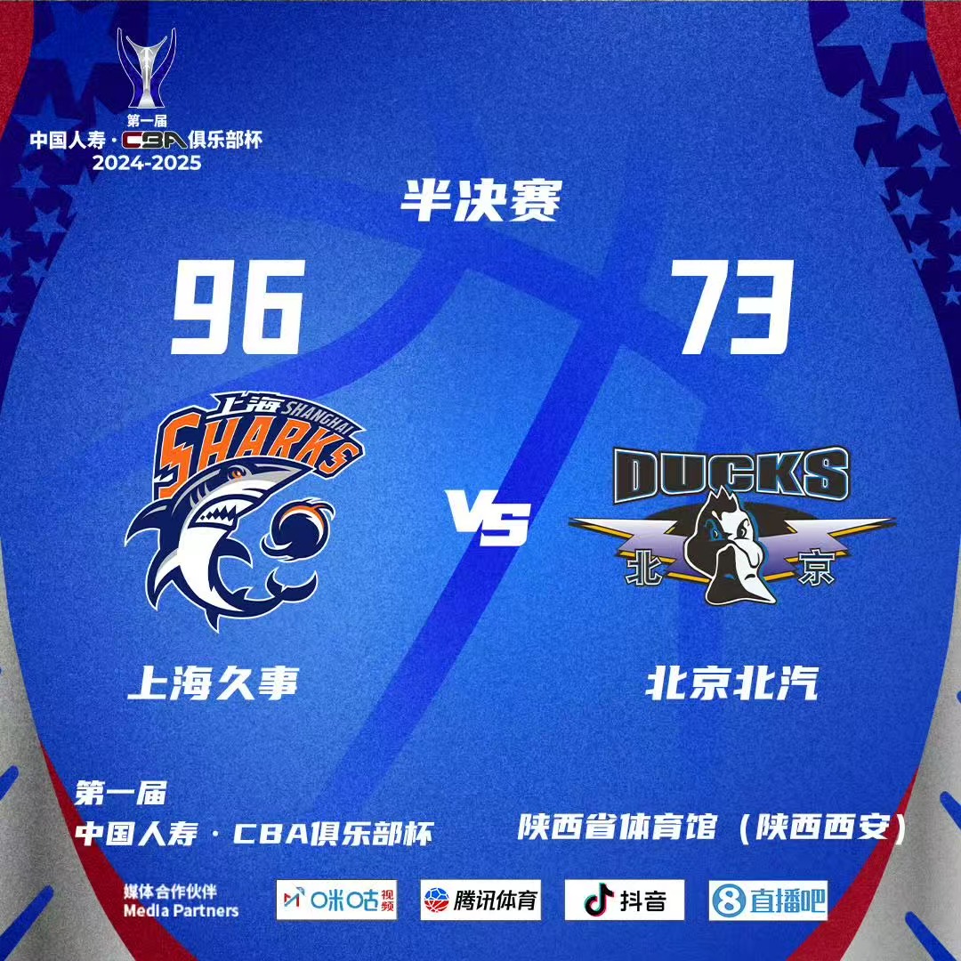 在首届CBA俱乐部杯半决赛的第二场比赛中,北京时间12日,上海队以96-73击败老对手北京队,进入首届CBA俱乐部杯决赛。