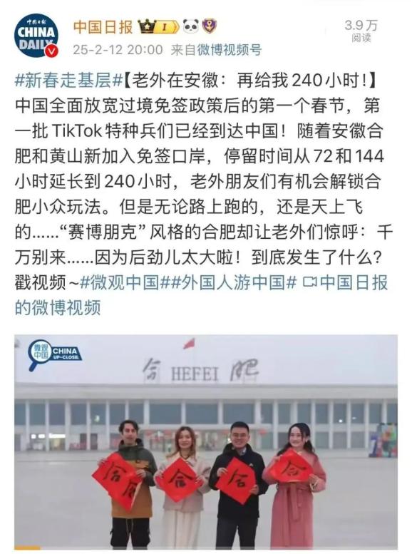 中国日报原文:安徽老外:再给我240个小时!在中国全面放宽过境免签政策后的第一个春节,首批TikTok特种兵已到达中国!由于安徽合肥和黄山新加入免签口岸,停留时间从72和144小时延长到240小时,外国人朋友有机会解锁合肥小众游戏。但不管是在路上跑,还是在天上飞….合肥的“赛博朋克”风格让外国人大吃一惊:千万不要来…因为后劲太大了!究竟发生了什么?