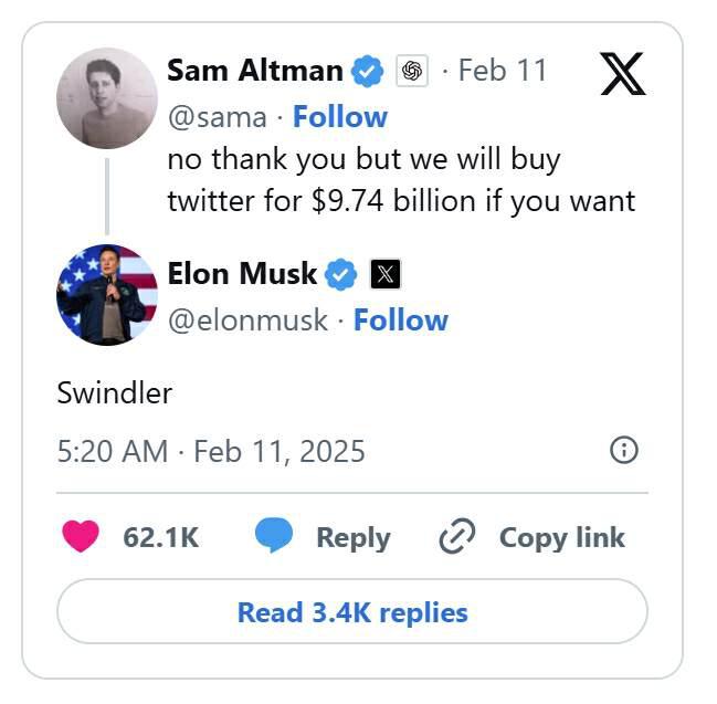 面临着马斯克提出的收购,OpenAI 在X上,CEO奥特曼回答说:“不,谢谢。”马斯克回答说:“骗子。”