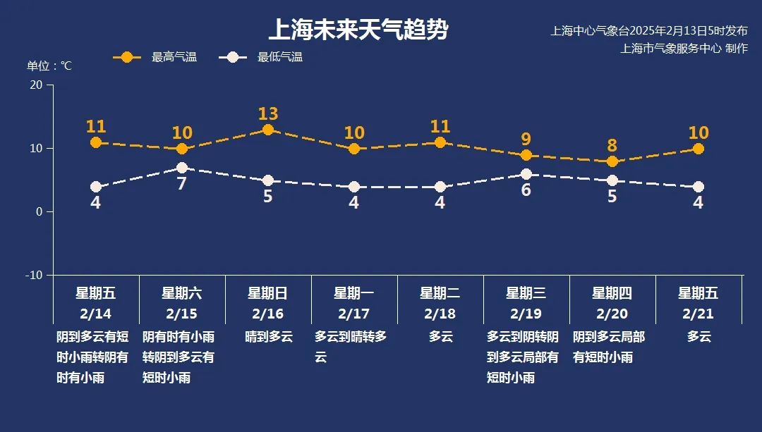 二月十四日(星期五):阴天有短时间小雨,有时有小雨,4天有小雨,~11℃