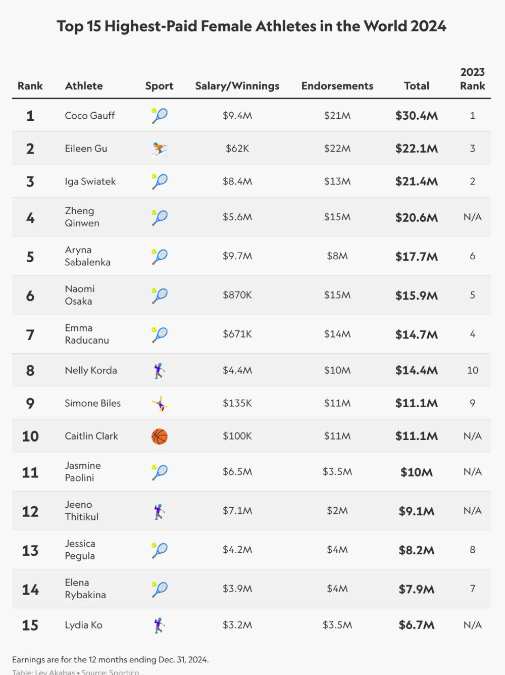 在商业市场上,郑钦文也迎来了巨大的收获。目前,郑钦文拥有十多个顶级品牌代言,其商业价值显而易见。据福布斯统计,郑钦文以2060万美元排名2024年全球女运动员收入榜第四。然而,2023年,这两个数字仍然是720万美元和第15名。