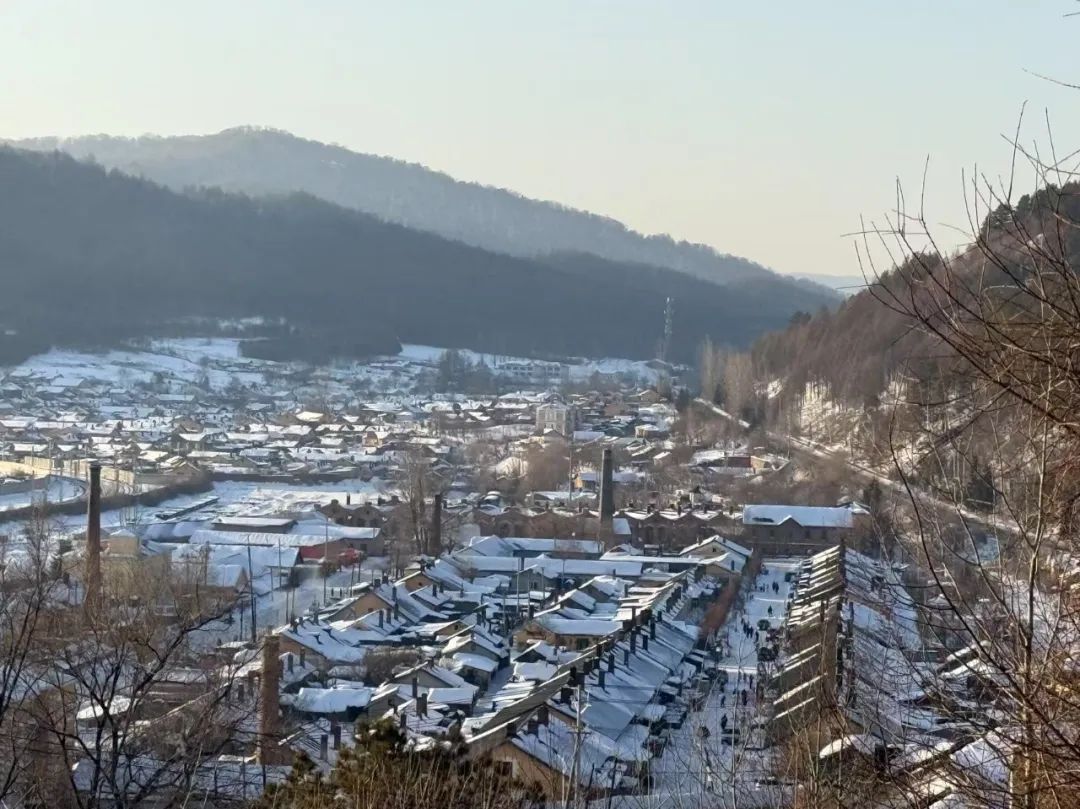 照片中,白雪覆盖的村庄、俄罗斯建筑的屋顶、废铁路和车站标志、无人居住的街道、红色的车辆和蓝色的天空。河边「北海道在中国」这个名字在小红书火了。