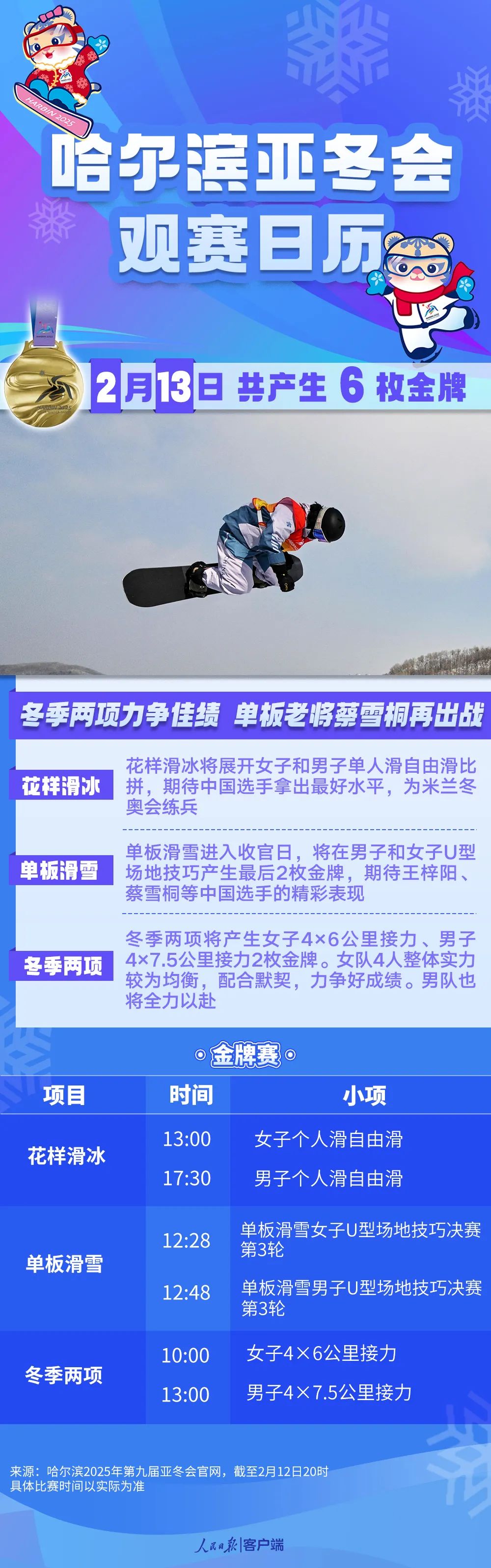 哈尔滨亚冬俱乐部将于13日产生6枚金牌。在亚布力赛区,单板滑雪U型场所技能和冬季接力赛将结束雪上项目。在冰上,图案滑冰将迎来男女自由滑冰比赛。
