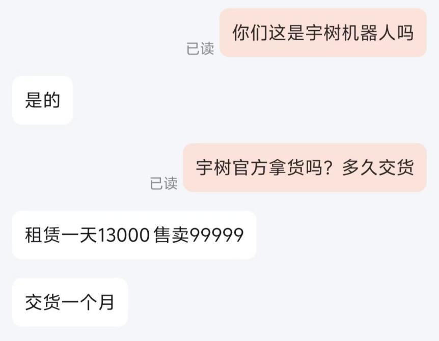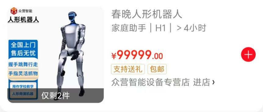 Unitree G1仍处于缺货状态,但JD.COM上还有其他商家出售。商家称之为原宇树机器人,每天租金1.3万元,售价9.9万元,交货期一个月。