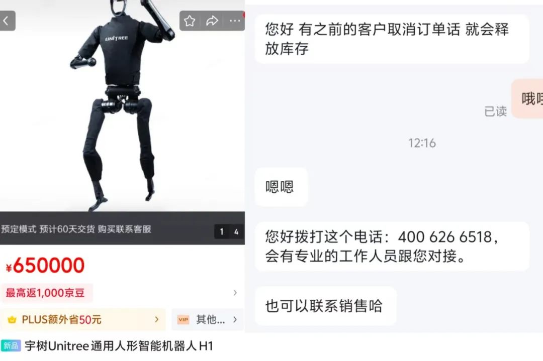 13日中午,Unitree H1突然显示出货物的状态。客户服务回应此波释放库存,即客户之前取消订单,可以拨打电话,与专业人员联系,或者联系销售。