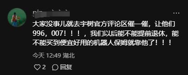 网民们直接呼吁,一起去宇树官方评论区催一催,以后能否买到便宜实用的机器人保姆就看它了!