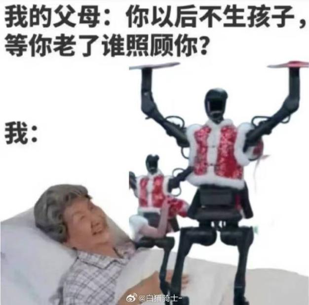 甚至在春节期间应对父母催婚催生的原因都有:不用担心老了没人照顾我,然后机器人当保姆。