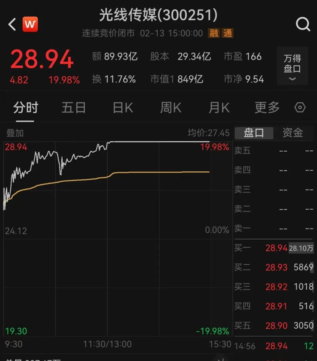 十三日下午,光媒股价触及涨停,再创新高,截至收盘报告28.94元,春节后累计上涨超过200%,市值达到848.99亿元,比1月27日上涨超过560亿元,已成为a股市值最高的影视院线公司。