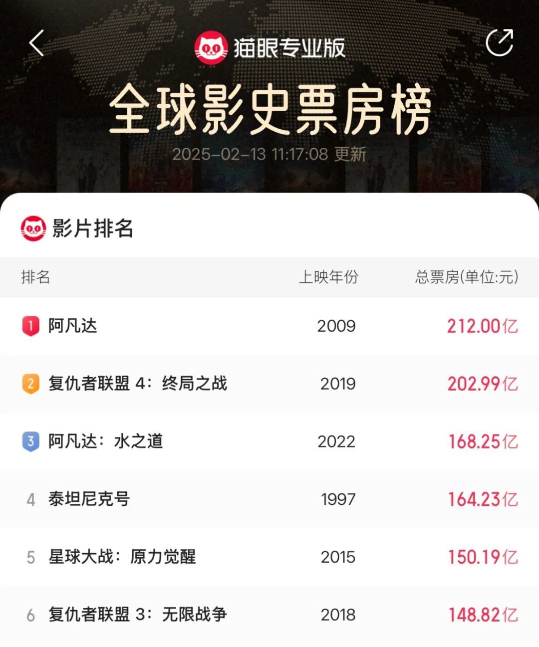 现在,猫眼专业版《哪吒2》的票房预测已超过160亿元,如果最终达到这一数字,就可以成为全球影史票房榜第五名,仅次于《阿凡达》《复仇者联盟4》:最后的战争,阿凡达:水之道,泰坦尼克号。
