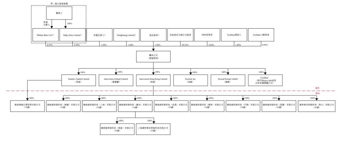 假设没有TechStar 图达通创始人鲍君威在a类股东赎回股权后,将采用其旗下High。 Altos 通过Phthaloolood,Limited控制公司4.59%的投票权 Blue 通过Enlightninging,LLC控制8.07%的投票权。 Limited(员工持股计划)持仓1.08%,共有14.8%的投票权受委托股东持股1.06%;创始人、CTO李义民持仓1.69%,TechStar发起人持仓1.84%,TechStar A类股东持有8.09%的股份;在PIPE投资者中,黄山建投资本持仓2.85%,富策持仓1.15%,珠海横琴华盖持仓0.06%。