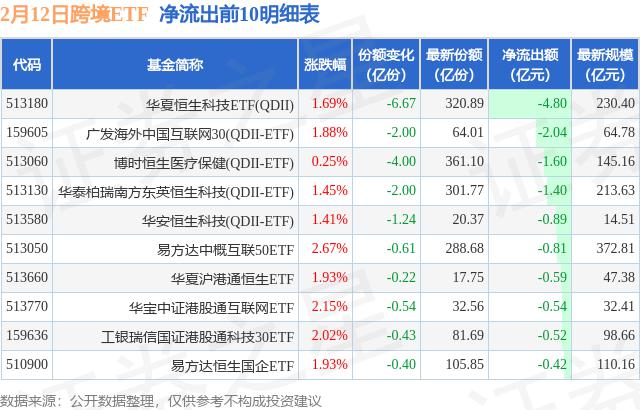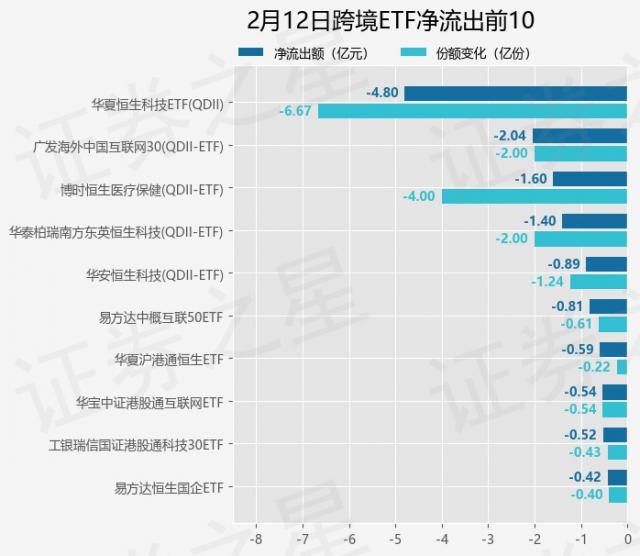 当天有 29 只跨境 ETF 资金净流出出现在基金中,其中华夏恒生科技排名第一。 ETF ( QDII ) (513180),份额下降 6.67 一亿份,净流出额为 4.8 亿元。