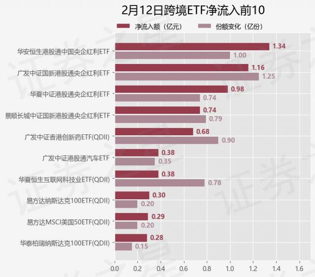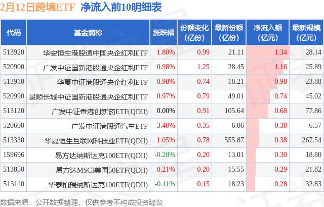 当天有 49 只跨境 ETF 资金净流入出现,其中华安恒生港股通中国央企净流入排名第一。 ETF(513920),份额增加 9950.0 万份,净流入额为 1.34 亿元。