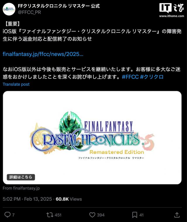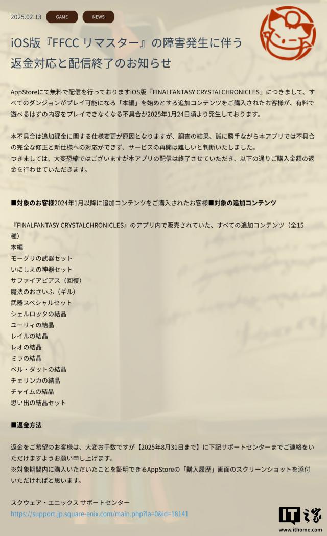 IT 世家 2 月 14 日消息,Square Enix 今天宣布,由于内购漏洞的应用,iOS 游戏《最终幻想:水晶编年史重制版》(Final Fantasy Crystal Chronicles Remastered)》马上停止运输。